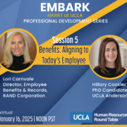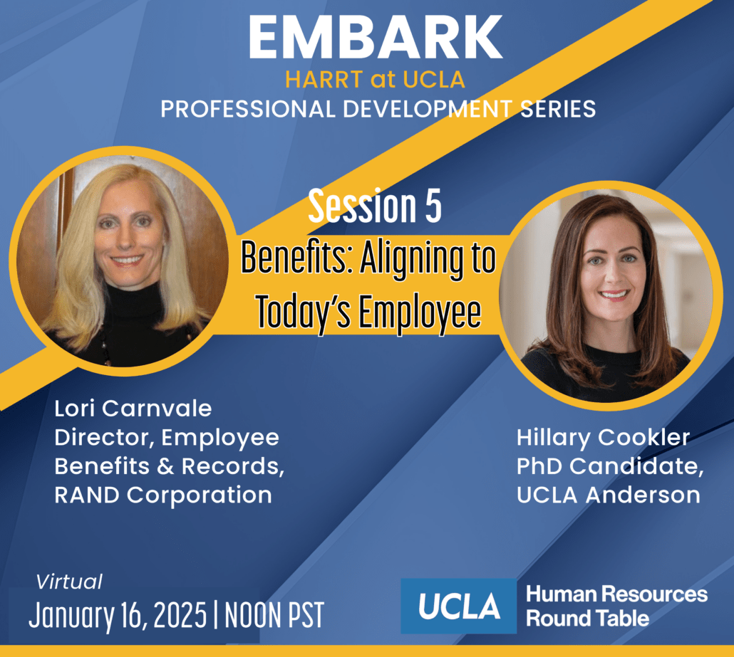 Join us for Session 5 of EMBARK, HARRT’s topic-driven professional development series designed and led by HARRT Members. The topic of our fifth installment will be Benefits: Aligning to Today’s Employee. Our facilitator is Lori Carnvale, Director, Employee Benefits & Records, RAND Corporation and our guest speaker, Hillary Cookler, UCLA Anderson PhD candidate.